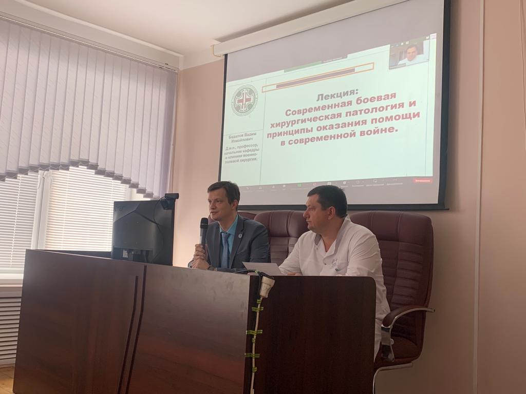 Первая лекция была прочитана заведующий кафедрой военно-полевой хирургии Военно-медицинской академии имени С.М. Кирова МО РФ полковником медицинской службы, профессором, д.м.н., Вадимом Измайловичем Бадаловым. Тема: «Современная боевая хирургическая патология и принципы оказания помощи в современной войне». Профессор доложил об основных этапах эвакуации раненных в современной военной ситуации, провел аналогию с историей: оказание помощи в Великой Отечественной войне.