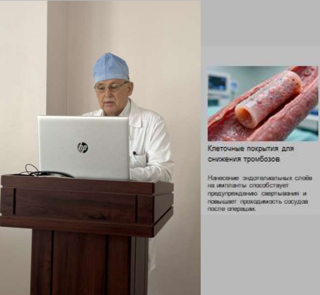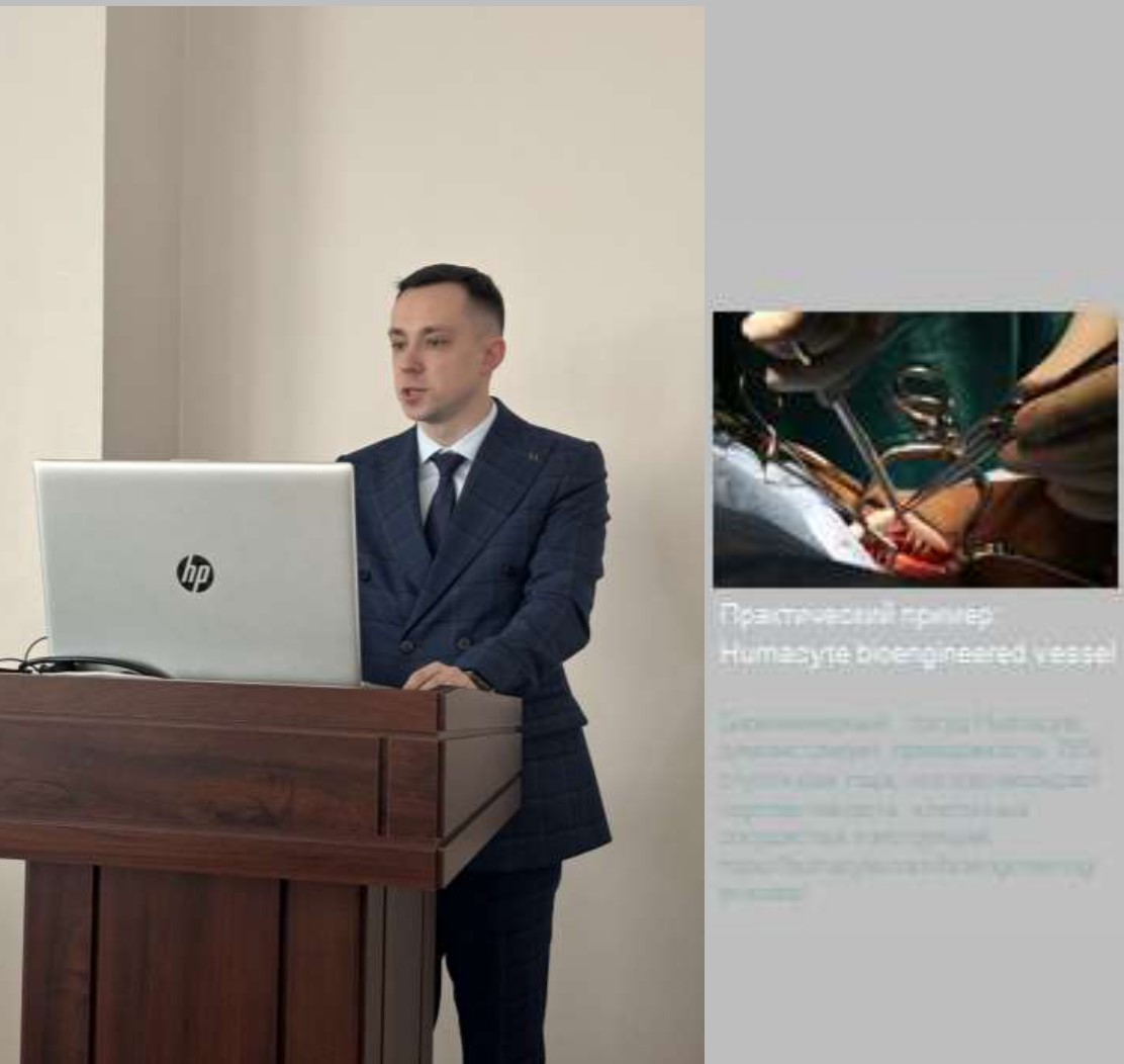 Второй доклад носил научный характер. Денисов Артём Александрович, ассистент кафедры оперативной хирургии и топографической анатомии, представил квинтэссенцию научных разработок ткане инженерных конструкций, применяемых хирургии, а также рассказал о перспективных проектах Курского государственного медицинского университета (КГМУ).